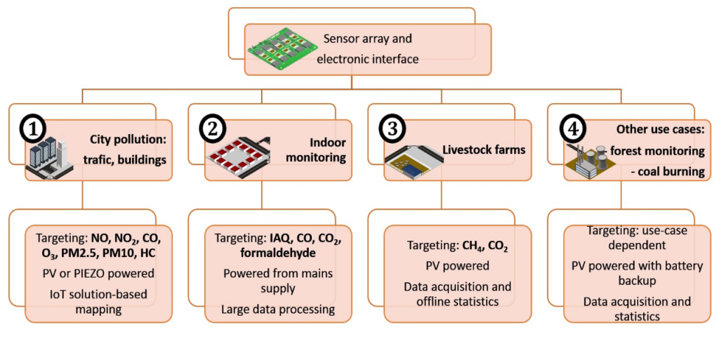 The scientific project Wearable or portable platform for air monitoring will demonstrate all principles involved (self-powered green platform, findable, accessible and reusable data, direct control of air quality, prediction algorithms, medium deployment with 100 users directly involved) through 4 use cases, the details of which are given in the diagram below.